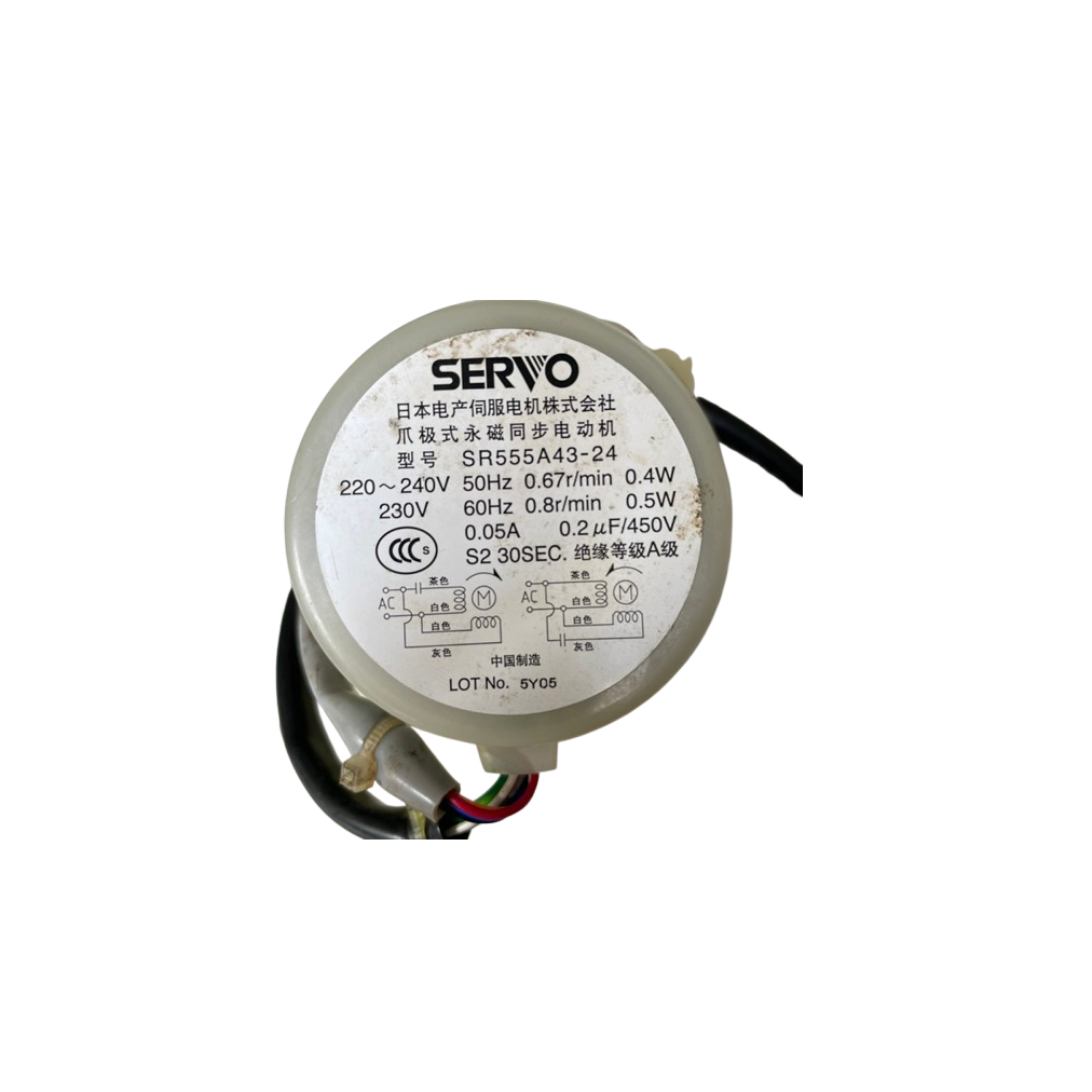 Động cơ SR555A43-24 được sản xuất bởi tập đoàn Nidec Servo (hoặc thương hiệu Servo) – đối tác chiến lược cung cấp linh kiện cho Hoshizaki trên toàn cầu. Đây là loại động cơ xoay chậm (synchronous motor) với các thông số kỹ thuật khắt khe:
